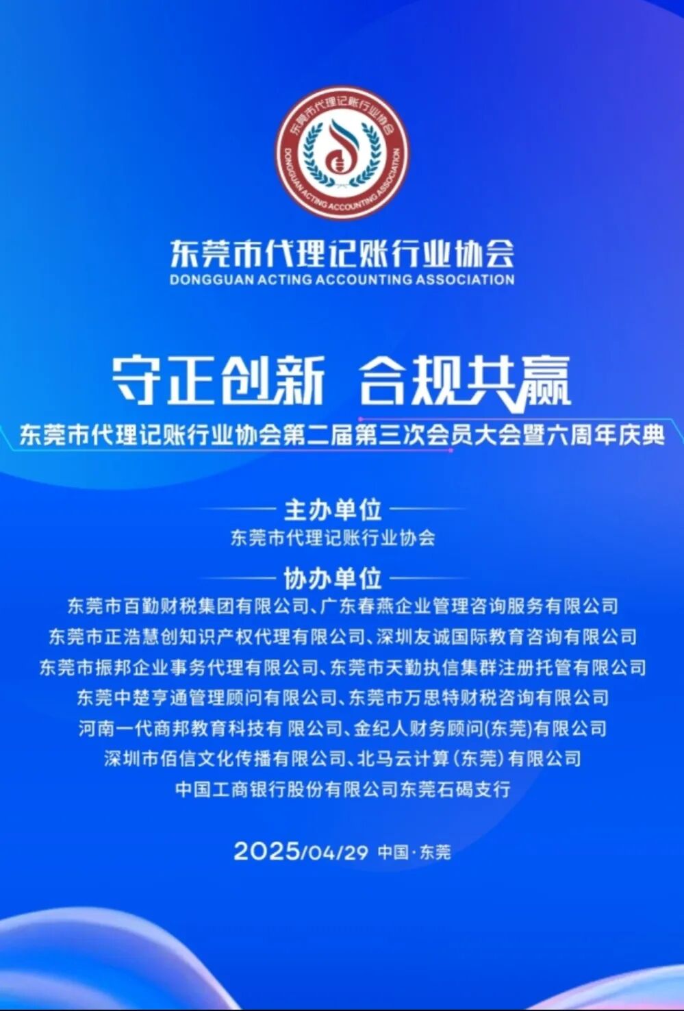 4月29日,东莞市代理记账行业协会隆重举办"第二届第三次会员大会暨六周年庆典",活动以"守正创新 合规共赢"为主题,汇聚行业精英,共话发展蓝图。